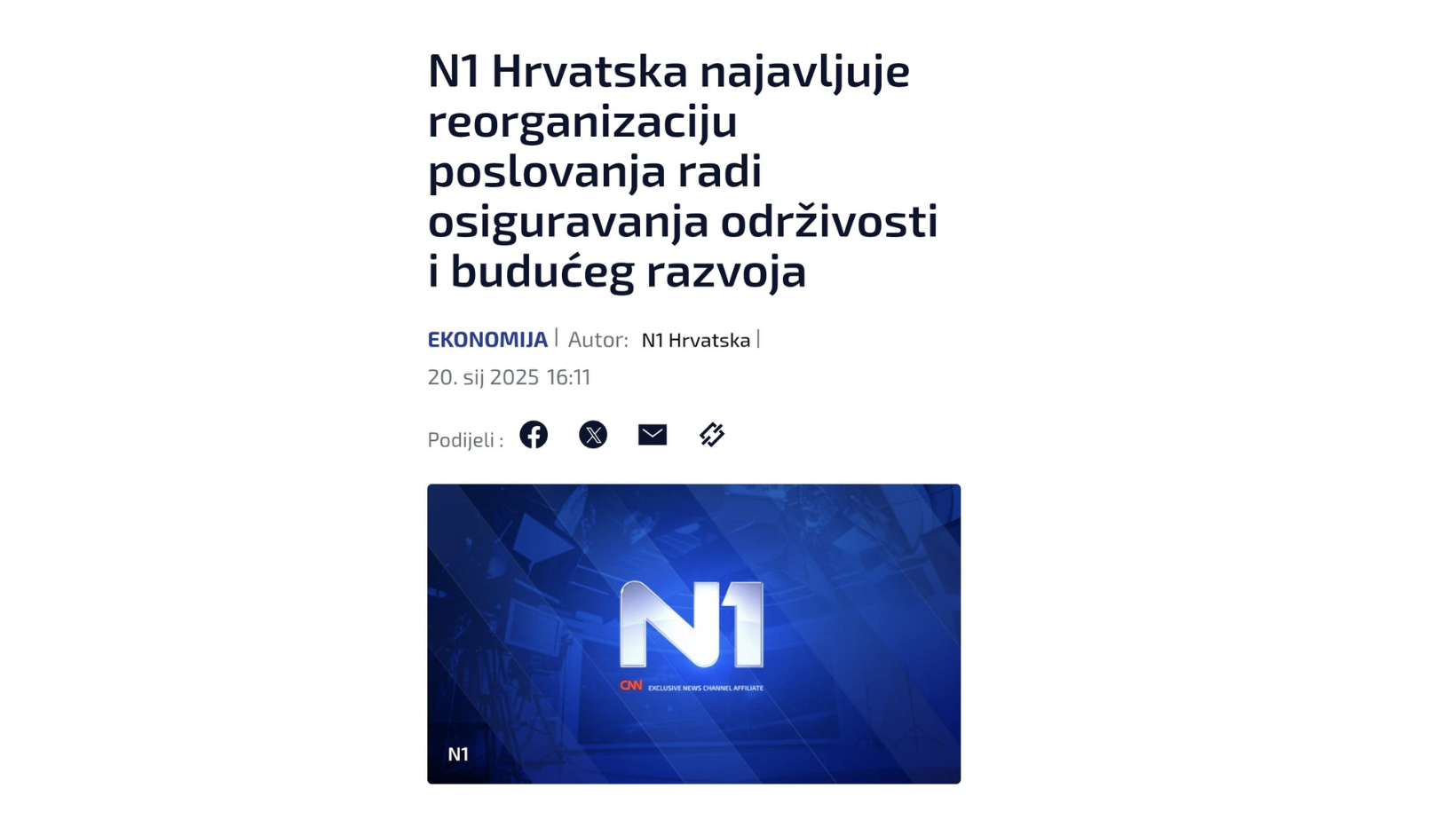 Iz N1 Hrvatske najavljeno da tvrtka ide u reorganizaciju poslovanja radi osiguravanja održivosti i budućeg razvoja. Sindikat novinara Hrvatske pokušava u skladu sa Zakonom o radu i pravilima socijalnog dijaloga prikupiti sve dostupne informacije o pravim planovima koji se u priopćenju tvrtke nazivaju reorganizacijom. Razvoj događaja izaziva osjećaj zabrinutosti radna mjesta, za budućnost programa I emisija. N1 televizija od neprocjenjive je važnosti za Hrvatsku. Kao jedan od najvažnijih izvora nezavisnog novinarstva i profesionalnih standarda, N1 je temelj za informiranje građana, zaštitu demokratskih vrijednosti i osiguravanje transparentnosti u društvu. Novinari N1 televizije predstavljaju glas istine, nepristranosti i odgovornog izvještavanja, reorganizacija koja bi vodila drastičnom smanjenju radnih mjesta i postojećeg programa veliki je udar na zaposlenike, ali i na pluralizam i slobodu medija u zemlji. Izražavamo zabrinutost zbog otkaza i ukidanja emisija i tražimo način za očuvanje ove važne medijske kuće i radnih mjesta kolegica i kolega koji su svojim radom svakodnevno pokazali što je pravo novinarstvo i zašto je važno.