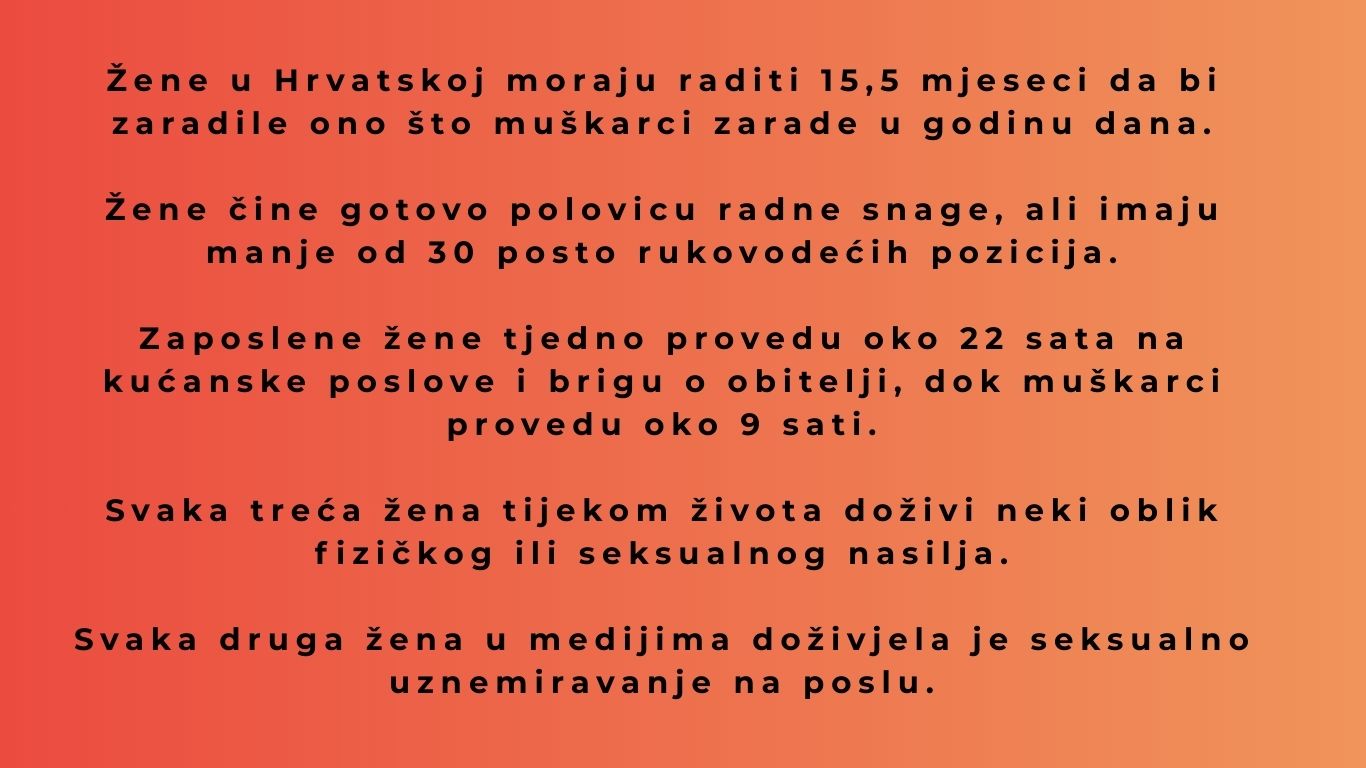 8. mart sve je samo ne sretan Dan žena, nije ni praznik ni dan za proslavu. U 2026. godine žene u Hrvatskoj moraju raditi 15 i pol mjeseci da bi zaradile ono što muškarci zarade u godinu dana, čine 47 posto ukupne radne snage, ali manje od 30 posto rukovodećih mjesta, nose najveći teret neplaćenog rada u kućanstvu, Hrvatska je tek na 21. mjestu u Europskoj uniji po Indeksu rodne ravnopravnosti . Pravobraniteljica za ravnopravnost spolova uz ove podatke upozorava i da svaka treća žena tijekom života doživi neki oblik fizičkog ili seksualnog nasilja te da su žene i dalje nedovoljno zastupljene u političkom odlučivanju, pa tako u Vladi RH drže tek 22 posto ministarskih mjesta, dok ih je u Saboru 33 posto. Ujedinjeni narodi iznose podatak da bi prema sadašnjoj razini napretka svijetu moglo trebati više od 130 godina da se postigne puna ravnopravnost žena i muškaraca.