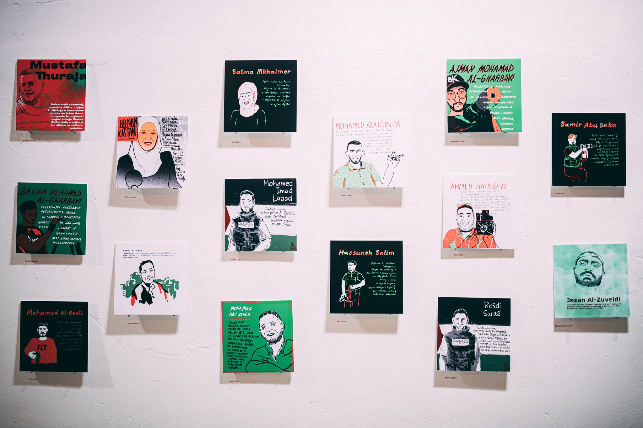 Izložba ilustracija ‘Učinili smo što smo mogli, zapamtite nas’ gostovala je nedavno na Europskom festivalu novinarstva i medijske pismenosti – Voices, održanom krajem veljače u Muzeju suvremene umjetnosti u Zagrebu. Izložbom koju je inicirao Sindikat novinara Hrvatske želi se odati počast novinarkama i novinarima ubijenim tijekom genocida u Gazi, ali i poticati na nastavljanje njihove borbe za slobodno novinarstvo, otpor cenzuri, okupaciji i genocidu. Izložba je prvi puta postavljena u Zagrebu u listopadu 2024. godine, u galeriji KLET, a tijekom tri dana trajanja izložbe prikupljeno je 1120 eura donacija koje je Sindikat novinara Hrvatske u studenom 2024. godine uplatio Palestinskom sindikatu novinara. Početkom prosinca lanjske godine izložba je gostovala u Ostavinskoj galeriji u Beogradu, u sklopu Dana solidarnosti s narodom Palestine koje je organizirala inicijativa Za slobodnu Palestinu. Tada je prikupljeno 1010 eura donacija, koje je Palestinskom sindikatu novinara uplatila beogradska inicijativa Za slobodnu Palestinu. Donacije za rad Palestinskog sindikata novinara nastavili smo prikupljati i tijekom gostovanja izložbe ‘Učinili smo što smo mogli, zapamtite nas’ u Muzeju pobjede u Šibeniku krajem 2024. godine. U akciju za Palestinski sindikat novinara solidarno su se početkom ove godine uključile i naše kolegice iz Kina Unseen, koje su 30. siječnja prikupljale donacije na projekciji programa ‘Podsjetnici za budućnost – Jugoslavija i oslobodilački pokreti’ u Dokukinu KIC. Za tu su prigodu štampane i torbe Za slobodnu Palestinu, a sva zarada od njihove prodaje proslijeđena je za rad Palestinskog sindikata novinara.