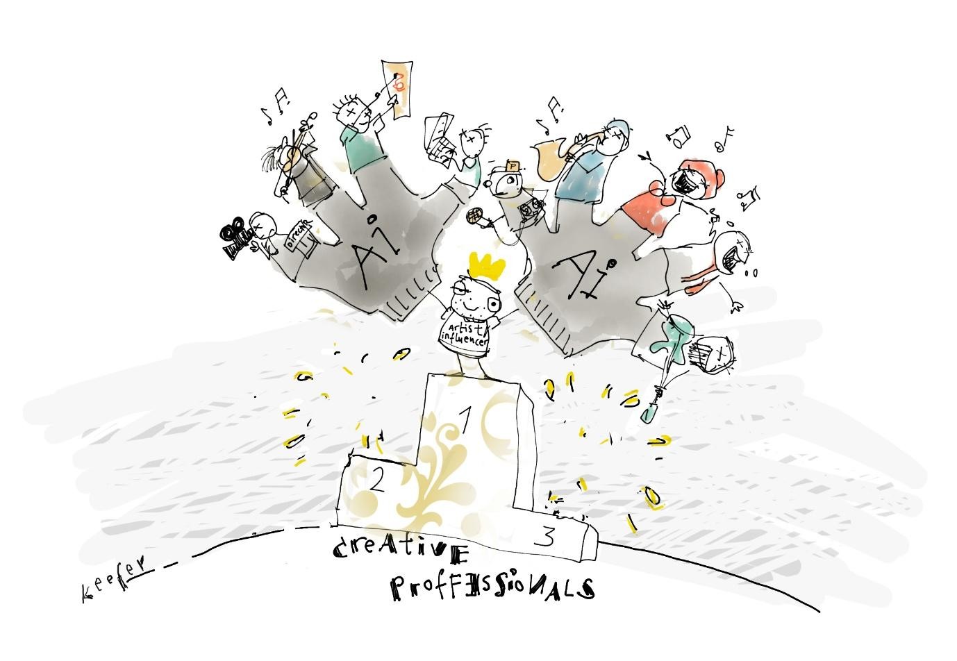 Glumci i filmske/TV ekipe AI vide prije svega kao pitanje koje treba kolektivno pregovarati i ograničiti. Novinari, jer već više koriste AI u svakodnevnom radu, jače naglašavaju potrebu za edukacijom, transparentnošću i jasnim pravilima korištenja. Glazbenici imaju raspršenije zahtjeve, ali snažno ističu autorska prava, naknade i opasnost od zamjene ljudskog rada jeftinim AI sadržajem.