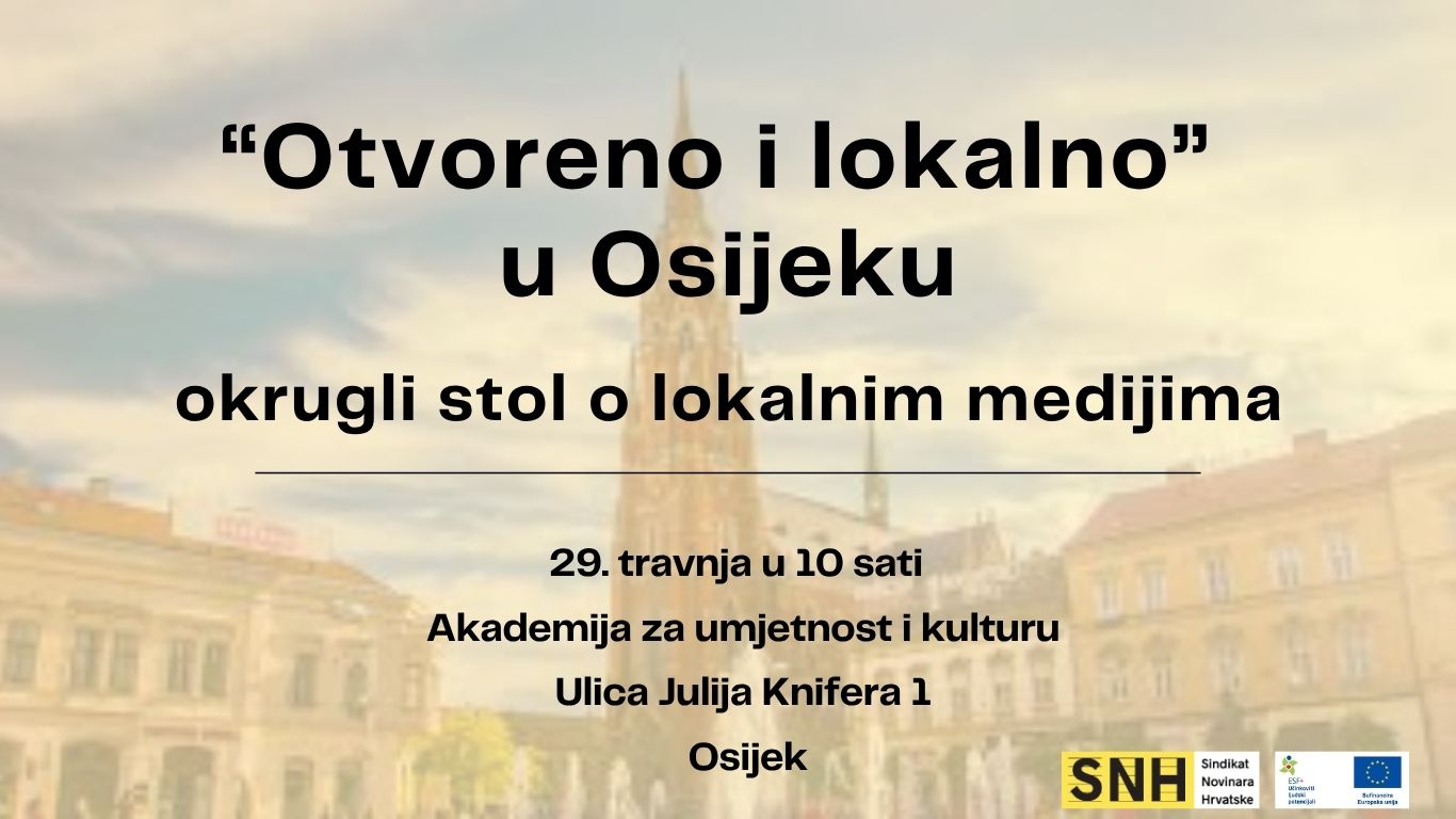 Sindikat novinara Hrvatske organizira okrugli stol „Otvoreno i lokalno“ koji će se održati u srijedu, 29. travnja 2026. godine u 10:00 sati u Svečanoj dvorani Akademije za umjetnost i kulturu u Osijeku. Događanje se organizira u suradnji s Akademijom za umjetnost i kulturu u Osijeku, u sklopu projekta „Socijalni dijalog za promjene: Jačanje kapaciteta socijalnih partnera u medijima kroz osposobljavanje i suradnju“, koji se provodi uz potporu Europskog socijalnog fonda plus (ESF+).